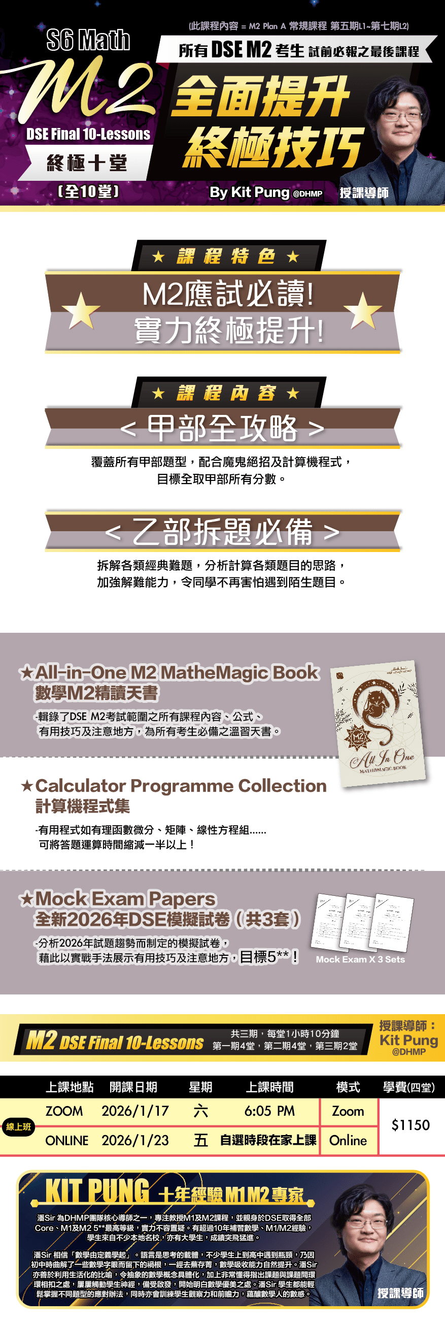 MathClass > Courses > 〖2026 DSE〗M2 終極十堂 (常規課程 M2 Plan A 第5-7期) 〖2026 DSE〗M2 終極十堂 (常規課程 M2 Plan A 第5-7期) Current Status Not Enrolled Price 1150/4堂(共10堂) Get Started This course is currently closed 〖2026 DSE〗M2 終極十堂 (常規課程 M2 Plan A 第5-7期)$575.00 – $1,150.00 此為線上課程。如需在分校領取筆記或報讀實體班,請親臨分校辦理。 筆記由順豐免費郵寄,不設分校自取。現貨筆記約 3-7 工作天送達。未開課課程將於開課前 1-2 天送達。感謝各位的耐心等候。如有疑問請 WhatsApp 97147808。 模式: ONLINE LIVE:ZOOM 直播授課。 ONLINE VIDEO:45天觀看期,每段影片限看2次。 M2 終極十堂期數&模式 請選取一個選項常規第5期|終極十堂第1期|Online Live 星期六 18:05-19:15 Pung|開課日:2026/1/17常規第5期|終極十堂第1期|Online Video|開課日:2026/1/23常規第6期|終極十堂第2期|Online Live 星期六 18:05-19:15 Pung|開課日:2026/2/14常規第6期|終極十堂第2期|Online Video|開課日:2026/2/20常規第7期|終極十堂第3期|Online Live 星期六 18:05-19:15 Pung|開課日:2026/3/14常規第7期|終極十堂第3期|Online Video|開課日:2026/3/20清除 〖2026 DSE〗M2 終極十堂 (常規課程 M2 Plan A 第5-7期) 數量 加入購物車 貨號: 不提供 分類: M2 描述 此課程與〖常規課程 M2 Plan A 第5-7期〗相同,如同學已報〖常規課程 M2 Plan A 第5-7期〗則無需再報讀此課程。 ** 最後一期只有2堂 只設實體筆記: 📦 寄出後,我們會透過 WhatsApp 將運單號碼發送給你。 現貨筆記一般需時3 – 7個工作天,感謝各位的耐心等候。預購等候時間較久,但會在第一堂上課前送到~