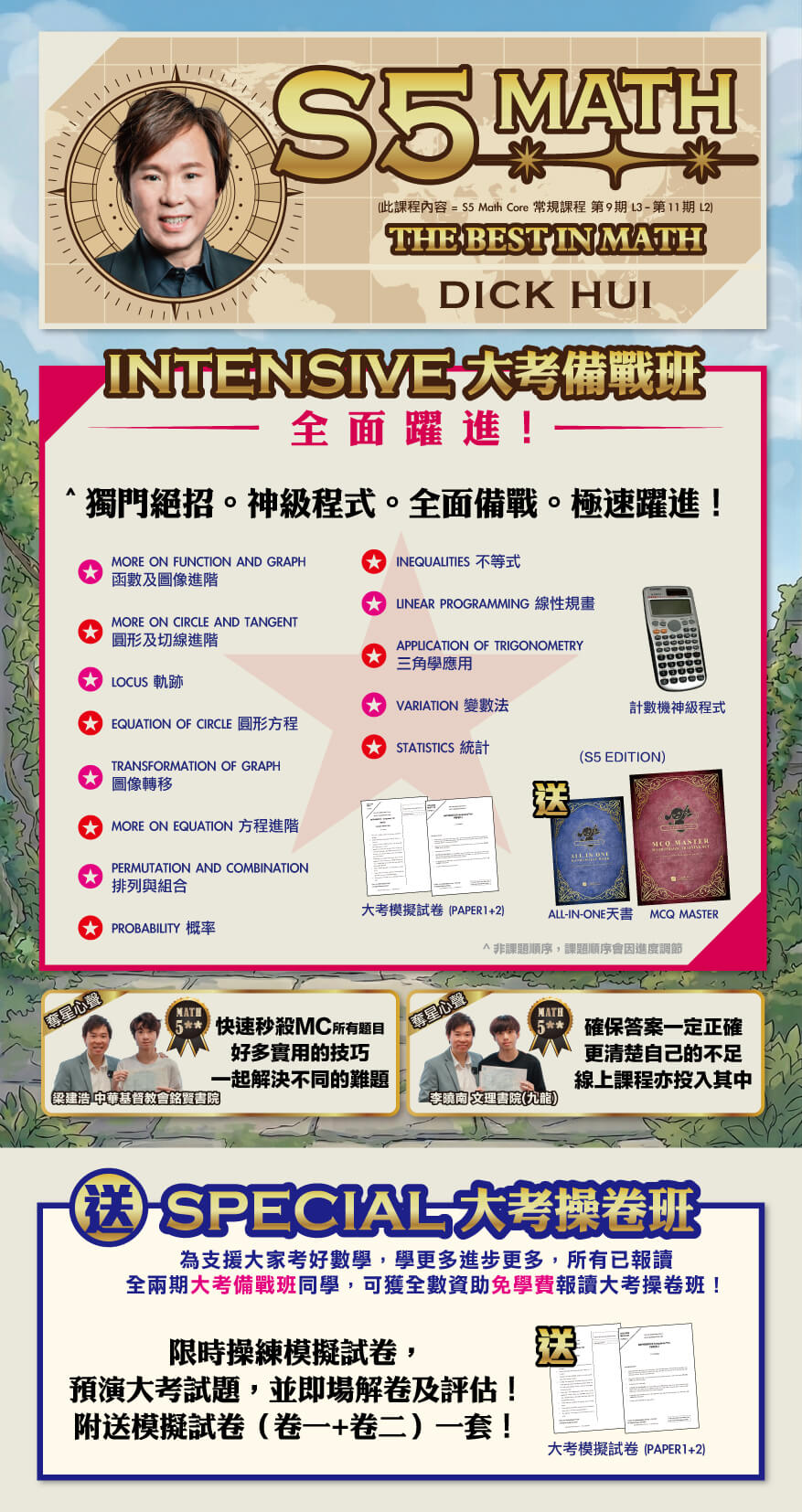 MathClass > Courses > S5 數學大考備戰班 – DICK HUI(常規課程第9期L3-第11期L2)〖報兩期送大考操卷班〗 S5 數學大考備戰班 – DICK HUI(常規課程第9期L3-第11期L2)〖報兩期送大考操卷班〗 Current Status Not Enrolled Price 2200/8堂*另送一節大考操卷班(價值$480) Get Started This course is currently closed 特價 S5 數學大考備戰班 – DICK HUI(常規課程第9期L3-第11期L2)〖報兩期送大考操卷班〗$1,100.00 – $2,200.00 此為線上課程。如需在分校領取筆記或報讀實體班,請親臨分校辦理。 筆記由順豐免費郵寄,不設分校自取。現貨筆記約 3-7 工作天送達。未開課課程將於開課前 1-2 天送達。感謝各位的耐心等候。如有疑問請 WhatsApp 97147808。 模式: ONLINE LIVE:ZOOM 直播授課。 ONLINE VIDEO:45天觀看期,每段影片限看2次。 已報讀25-26學年常規課程 S5 常規課程第9期L3-第11期L2 的同學,無須報讀此課程。 S5 模式 請選取一個選項〖報兩期送大考班〗第1+2期|Online Live 星期二 18:00-19:10 Dick Hui|開課日:2026/5/5〖報兩期送大考班〗第1+2期|Online Live 星期日 10:20-11:30 Terry|開課日:2026/5/10〖報兩期送大考班〗第1+2期|Online Video|開課日:2026/5/11第1期|Online Live 星期二 18:00-19:10 Dick Hui|開課日:2026/5/5第1期|Online Live 星期日 10:20-11:30 Terry|開課日:2026/5/10第1期|Online Video|開課日:2026/5/11第2期|Online Live 星期二 18:00-19:10 Dick Hui|開課日:2026/5/26第2期|Online Live 星期日 10:20-11:30 Terry|開課日:2026/5/31第2期|Online Video|開課日:2026/6/1清除 S5 數學大考備戰班 - DICK HUI(常規課程第9期L3-第11期L2)〖報兩期送大考操卷班〗 數量 加入購物車 貨號: 不提供 分類: 中五(S5) 描述 已報讀25-26學年常規課程 S5 常規課程第9期L3-第11期L2 的同學,無須報讀此課程。 [每期4堂,每堂1小時10分鐘。] Online Live: 星期二 18:00-19:10 Dick Hui/星期日 10:20-11:30 Terry Online Video: 星期一上傳影片 報兩期即送操卷班! 日期&時間: Online Live: 2026/6/5 18:10-19:40 Online Video: 2026/6/8 上傳影片 新生減$200優惠碼:newstudent 會有專人聯絡核對優惠資格